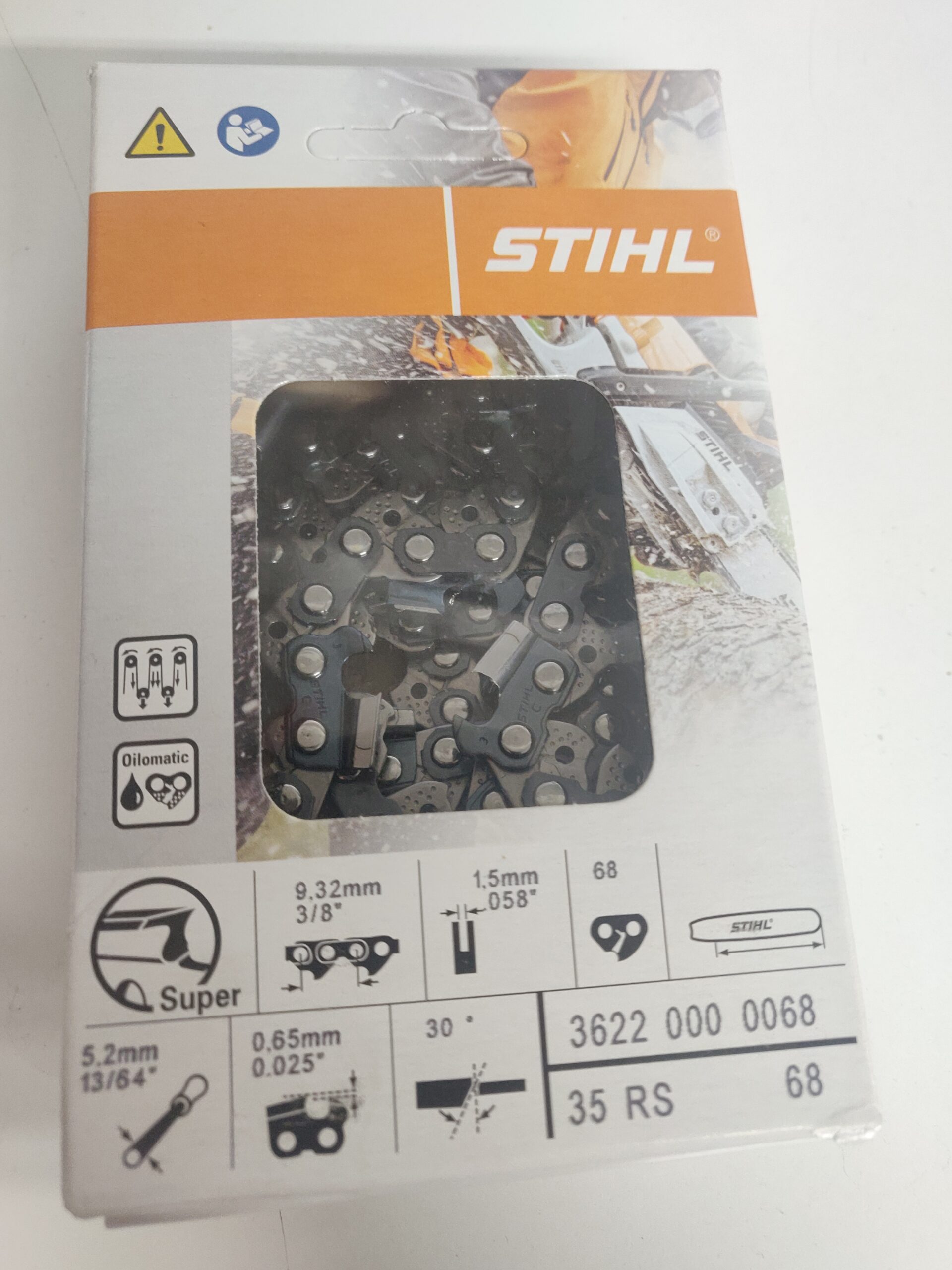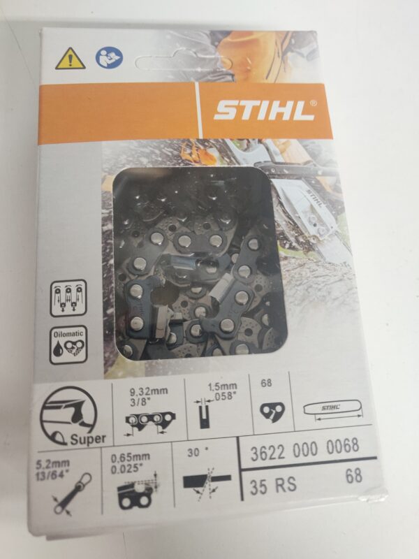 Catena Stihl 35 RS (Rapid Super) passo 3/8″ spessore 1,5 mm, 68 maglie con barra da 45 cm per motosega originale. Catena ad alte prestazioni per lavori professionali in campo forestale. Impiego: abbattimento, taglio a lunghezza, sramatura in boschi di dimensioni medio grandi con macchine di potenza medio alta.