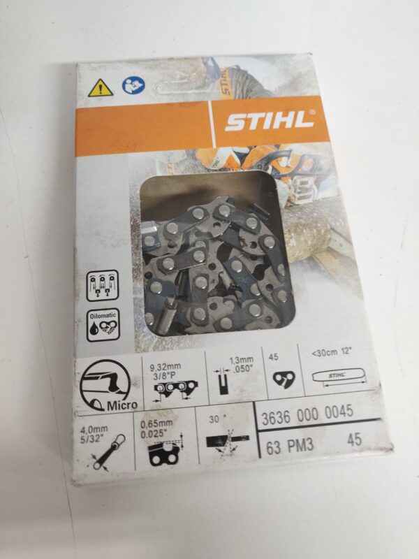 Catena Stihl 63 PM3 (Picco Micro 3) passo 3/8″ spessore 1,3 mm, 45 maglie con barra da 30 cm per motosega originale.