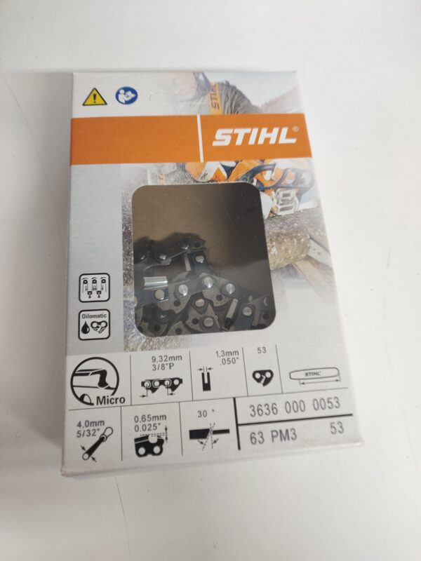 Catena Stihl 63 PM3 (Picco Micro 3) passo 3/8″ spessore 1,3 mm, 53 maglie con barra da 35 cm per motosega originale. Catena a profilo basso quasi priva di vibrazioni con una prestazione di taglio alta quanto una catena standard e al tempo stesso una tendenza ai contraccolpi ridotta. Indicata specialmente per l’impiego su motoseghe leggere. Ideale per tutti gli utenti che apprezzano le prestazioni quanto il comfort. La catena si presta perfettamente ad un uso per la raccolta di tronchetti, per la sramatura e per interventi di arboricoltura con seghe apposite.