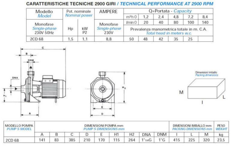 - Alimentazione monofase 230V-50Hz, autoprotetto con condensatore permanentemente inserito.
