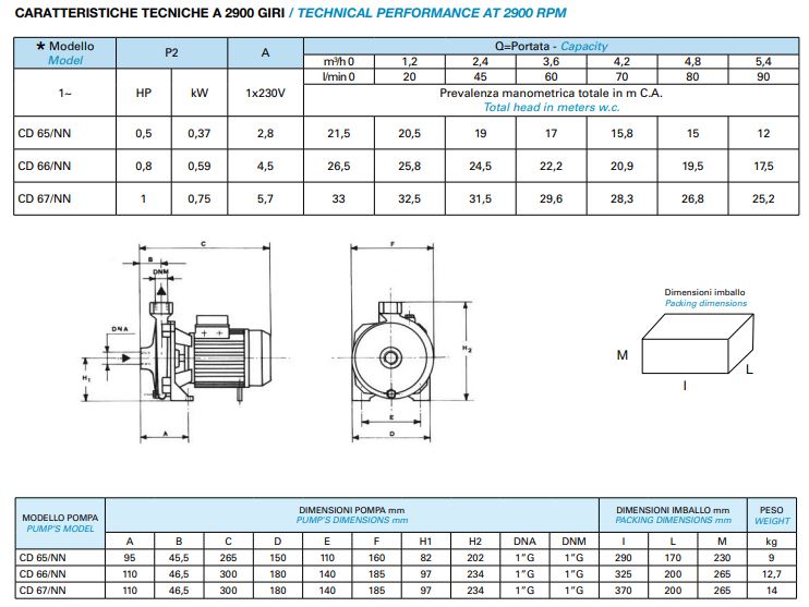 - Alimentazione monofase 230V-50Hz, con protezione termica