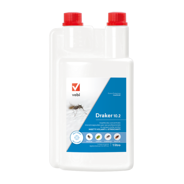 Draker 10.2 è un prodotto in formulazione altamente evoluta che unisce una spiccata azione abbattente ed una efficacia prolungata nel tempo grazie alla tecnologia della microincapsulazione. Questo insetticida concentrato su base acquosa non contiene solventi, è inodore e non macchia (testarlo prima dell’utilizzo su superfici delicate). DRAKER 10.2 elimina gli insetti presenti al momento del trattamento e previene l’insorgere di successive infestazioni per almeno 2-3 settimane. il prodotto è efficace contro la maggior parte degli insetti molesti o dannosi del settore civile, domestico e industriale, tra cui le zanzare.