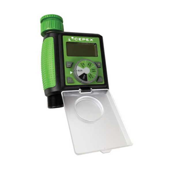 Centralina Cepex CTC075 Tap Controller, digitale a batteria con attacco diretto a rubinetto, facile da installare e programmare. Con copertura frontale protettiva trasparente che permette la visualizzazione del programma di irrigazione. Progettato per l’installazione all’aperto (IP66). Funzione di ritardo di irrigazione per pioggia (0-72ore).