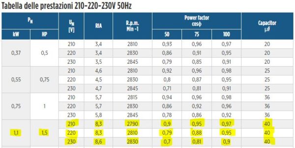 • Tensione nominale: 210-220-230/50 Hz ;380-415V/50Hz, 460V/60Hz